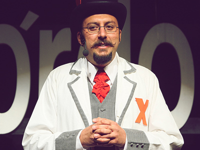 Gracias a sus habilidades como orador, en combinación con su excentricismo en el escenario, es posible ver a un conferencista, abordar el delicado tema de la vocación y la pasión profesional, expuesto con una serie de ejemplos visuales y circenses que llevan al público a las carcajadas y a la grata sorpresa de estar ante uno de los mejores